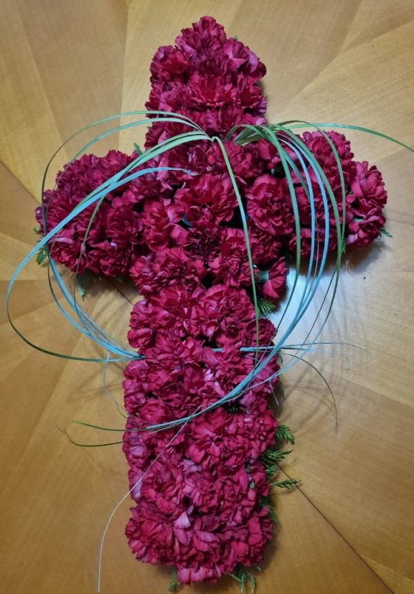 Centro de flores con una o dos pastillas, detalles pan, culata y cinta con dedicatoria.